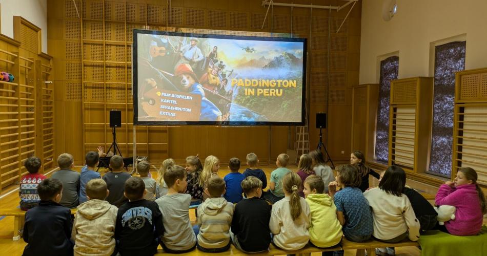 Im Turnsaal unserer Schule wurde kürzlich ein besonderes Kinoerlebnis geboten. Auf einer großen Leinwand konnten die Schülerinnen und Schüler den Schulfilm „Paddington in Peru“ in echtem Kinofeeling genießen. Durch das vollständige Abdunkeln des Raumes – ein großes Dankeschön an unseren Hausmeister Konni – kam richtige Kinoatmosphäre auf.