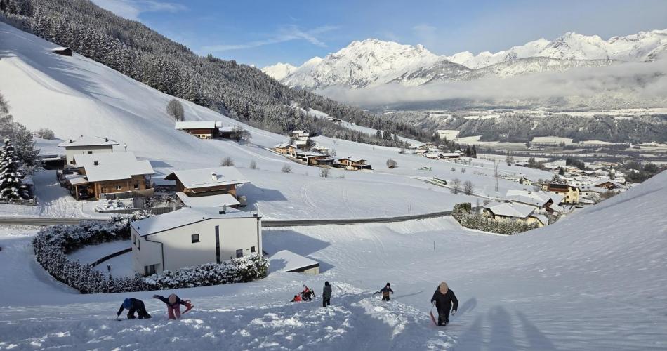 Mit Rutschblättern ausgerüstet zog es viele Kinder zum Hügel. Dort wurde gelacht und natürlich immer wieder den Hang hinuntergesaust. Ob...