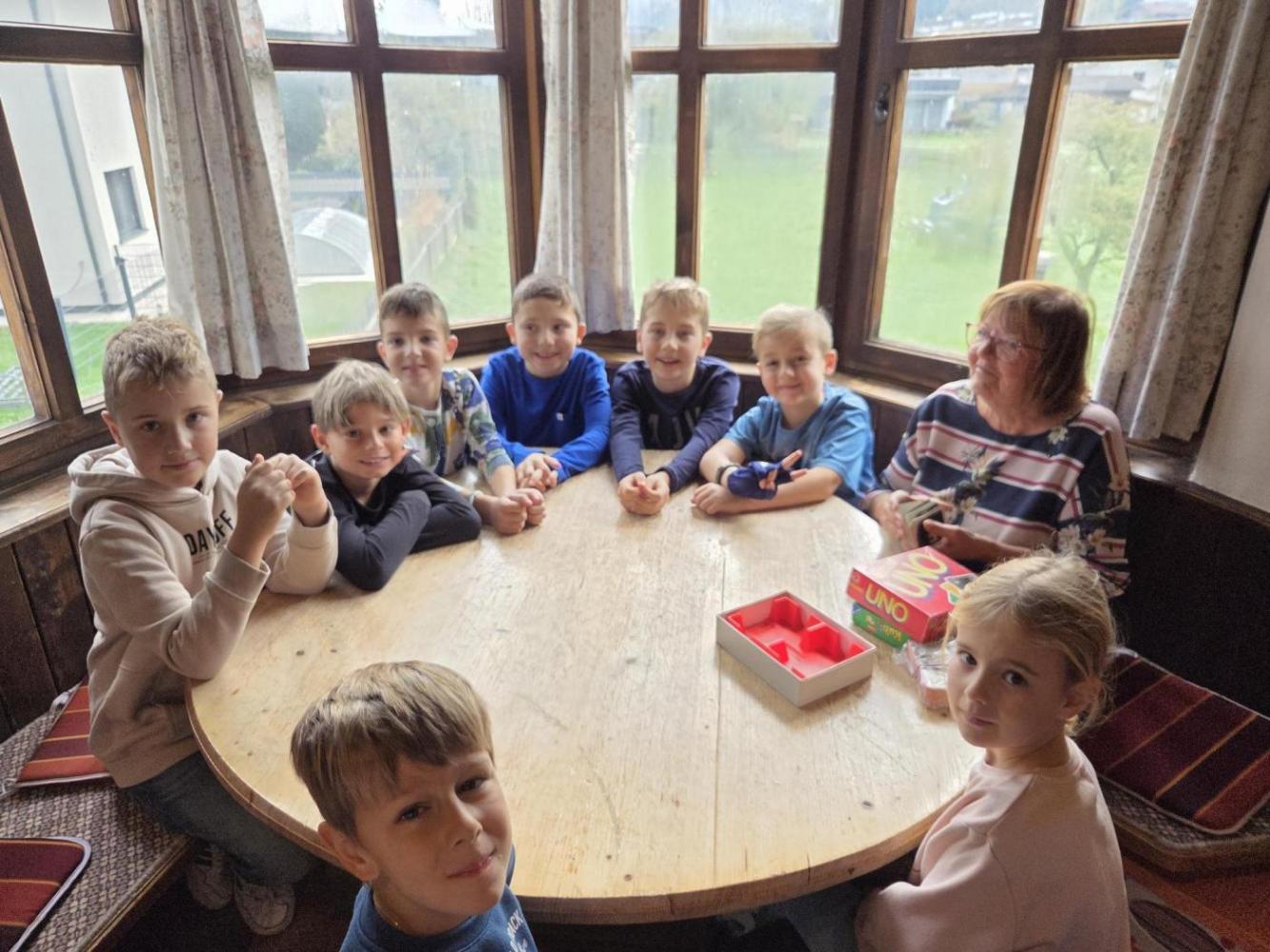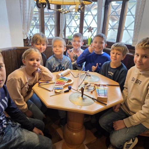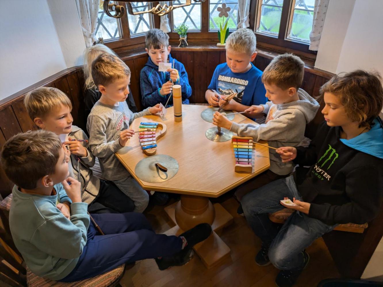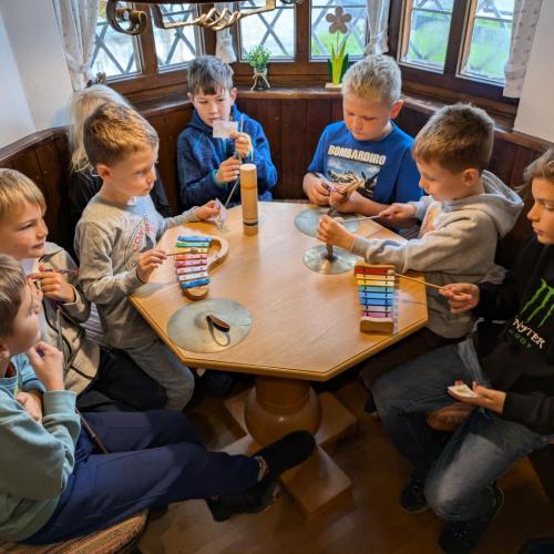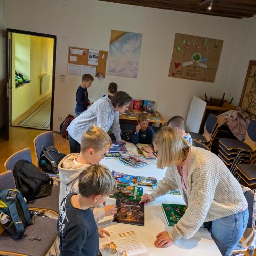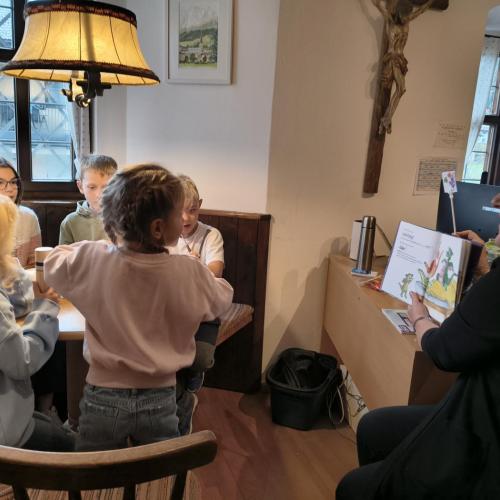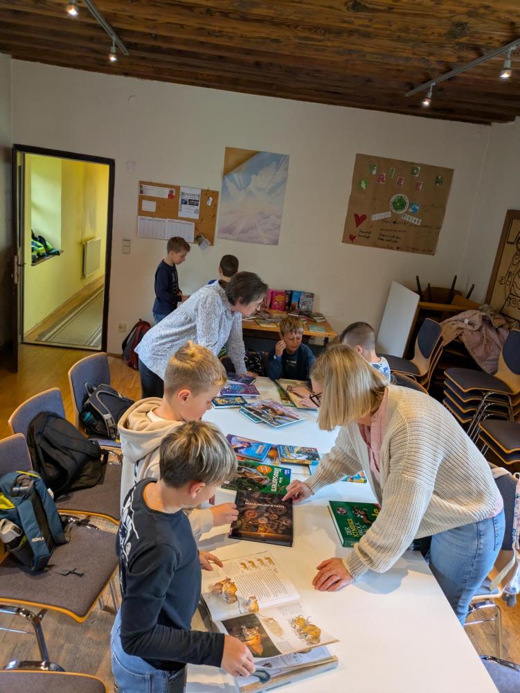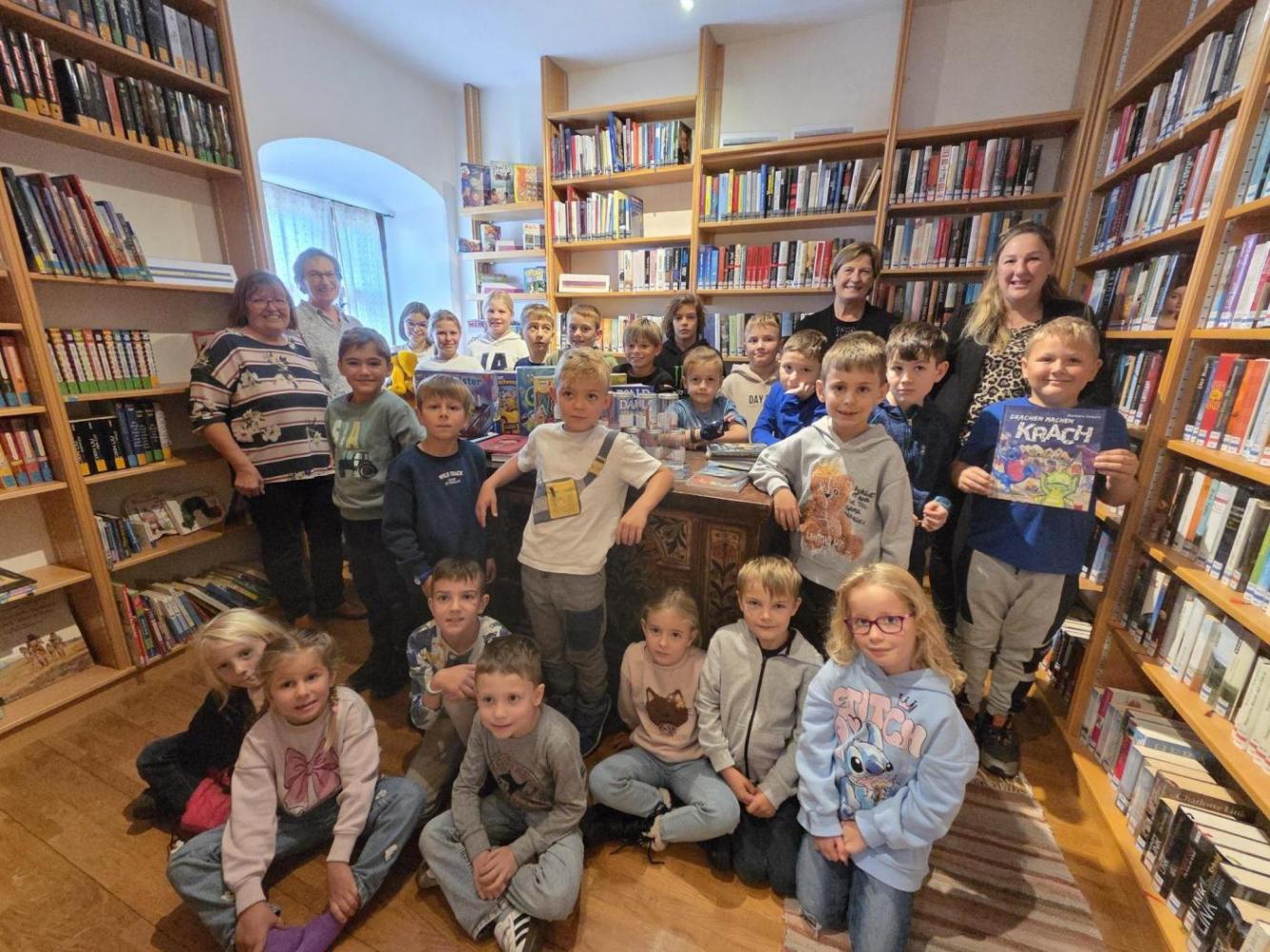 In der Bücherei angekommen, stärkten wir uns zuerst mit einer kleinen Jause, bevor es in drei Gruppen weiterging. Bei der ersten Station wurde die Klanggeschichte „Drachen machen Krach“ vorgelesen, und die Kinder durften sie mit Instrumenten lebendig begleiten. Bei der zweiten Station konnte nach Herzenslust in den Regalen gestöbert werden, und jedes Kind durfte sich ein oder gleich mehrere Bücher zum Ausleihen aussuchen. An der dritten Station wurde am Spieletisch eifrig UNO und Quartett gespielt – mit viel Lachen und guter Laune.