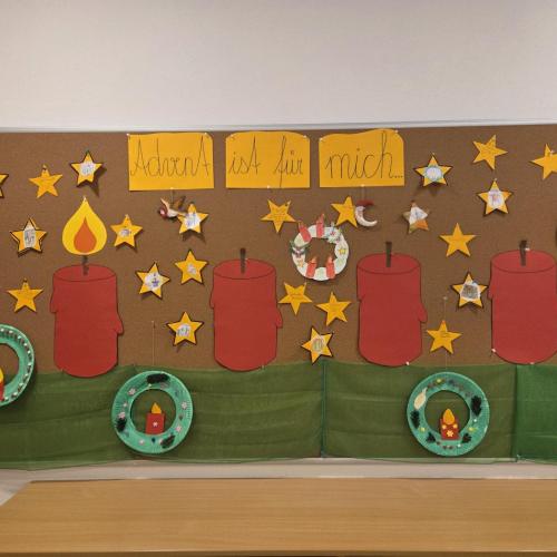 Schon in der Vorwoche war die Vorfreude auf die Adventzeit in unserer Schule deutlich spürbar. In den Klassenräumen wurde eifrig gebastelt, selbstgestaltete Sterne schmücken nun unsere Adventswand und auch die erste Kerze am Adventkranz durfte bereits entzündet werden.