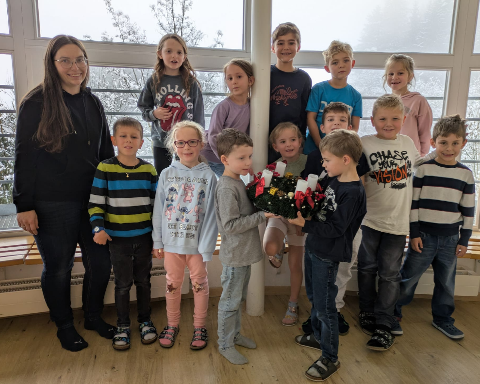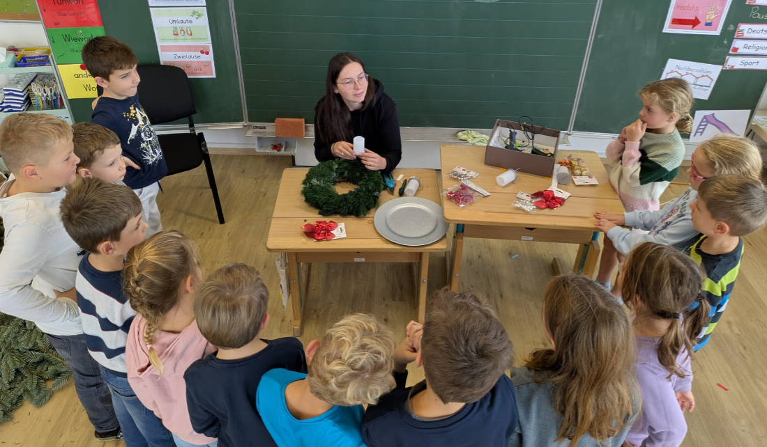Heute hatten die Kinder der 1. und 2. Klasse die besondere Gelegenheit, mit Unterstützung der Ortsbäuerinnen Birgit, Stefanie und Nicole ihre eigenen Adventkränze für die Klassen zu binden und anschließend zu verzieren. Mit viel Geduld, Kreativität und wunderschönen Tannenzweigen begleiteten die drei Frauen die Kinder durch den gesamten Prozess.