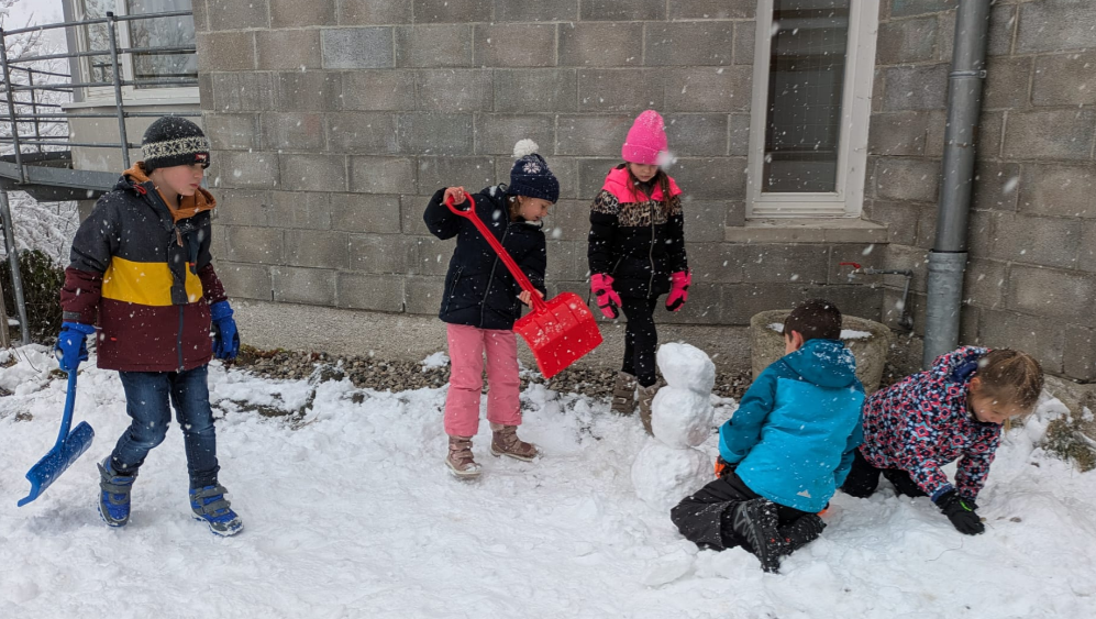 Die Kinder arbeiteten zusammen, lachten viel und verwandelten den Schulhof in eine lebendige Winterlandschaft.